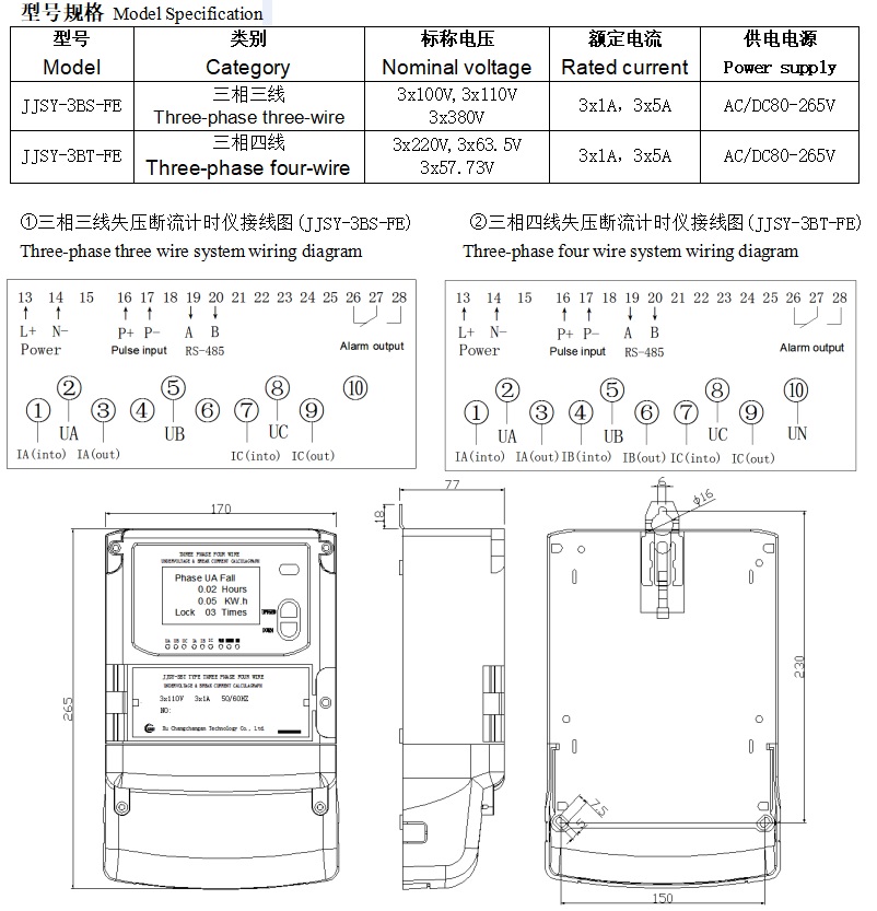 JJSY系列三相失壓斷流計時儀適用于電力三相三線、三相四線系統,通過對電網電壓(PT)回路、電流(CT)回路進行監視,能準確判斷電網運行狀態,并詳細記錄其處于故障期間的各種參數,以便供電部門對電網進行管理,追補人為或非人為的漏計電能。 全英文菜單
