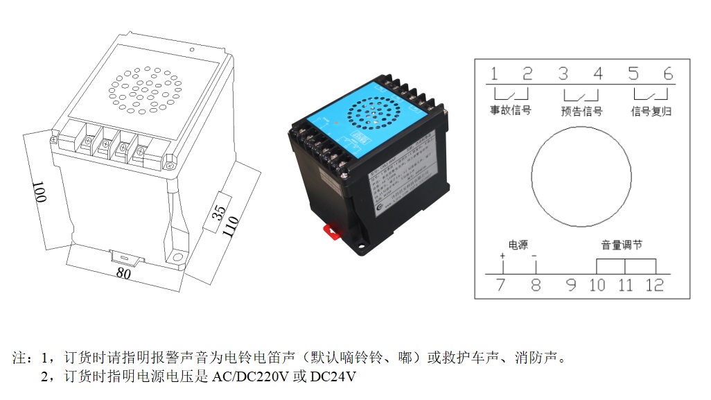 音量調節:報警器默認低音量,端子10-11-12三個端子為音量調節端子,10-11短接中音量,10-12短接高音量,不短接為低音量。