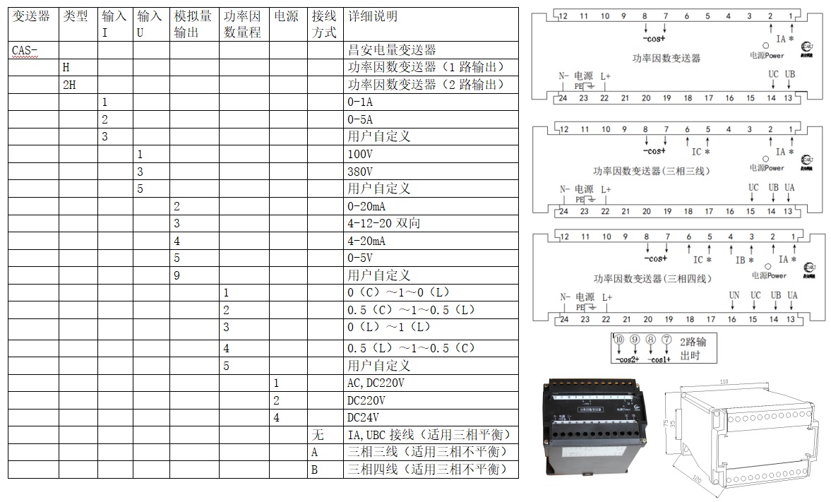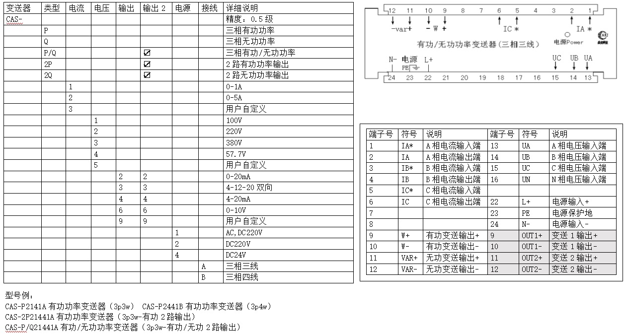 CAS系列功率變送器是將被測電流、電壓信號,通過內部CPU計算出有功功率、無功功率、功率因數等參量并輸出4-20mA等模擬量的設備。