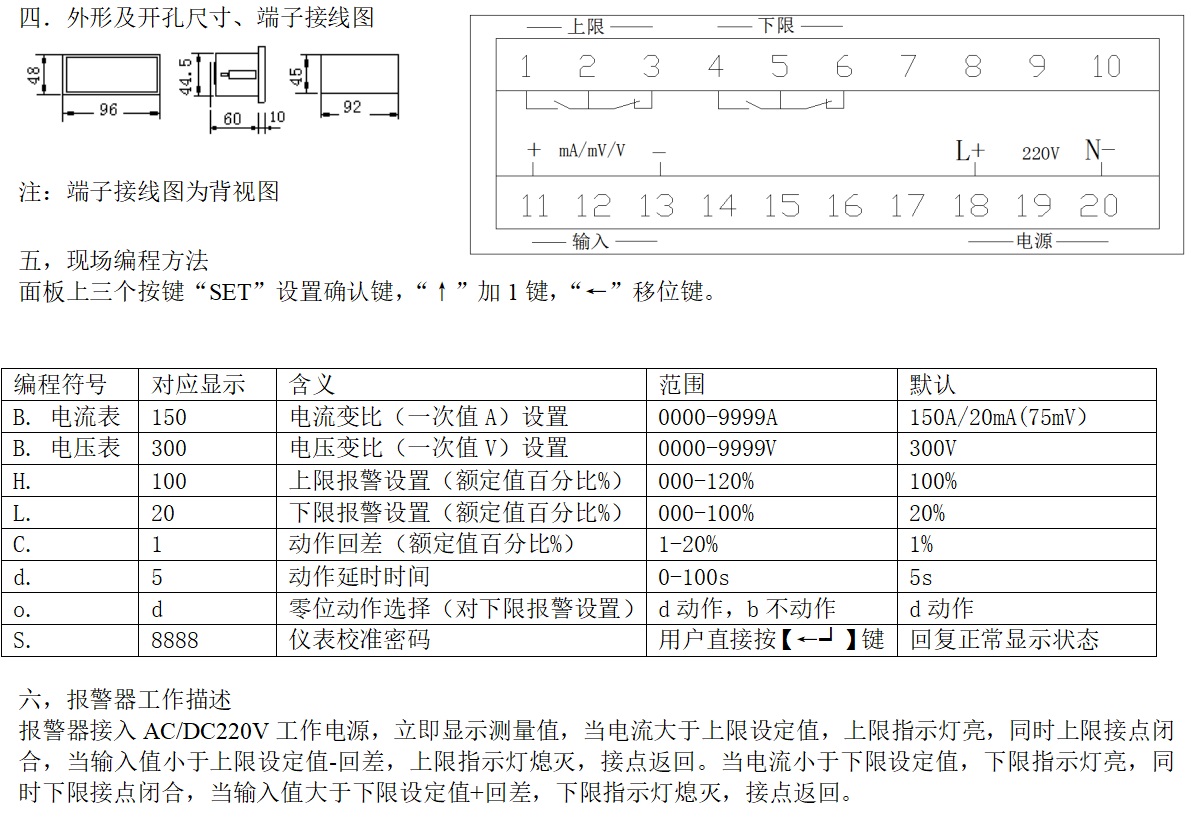 參數:直流電流或電壓測量,上限,下限報警