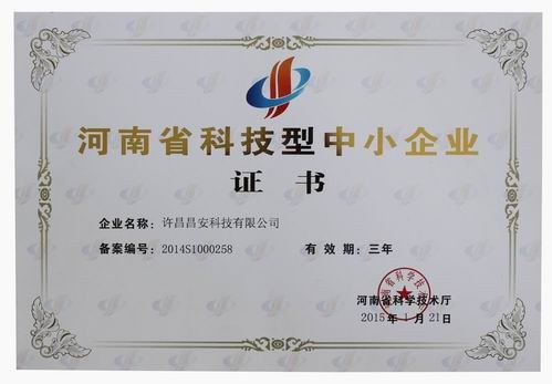 2015年1月21日,許昌昌安科技有限公司被河南省科學技術廳認定為“河南省科技型中小企業”,并頒發證書。